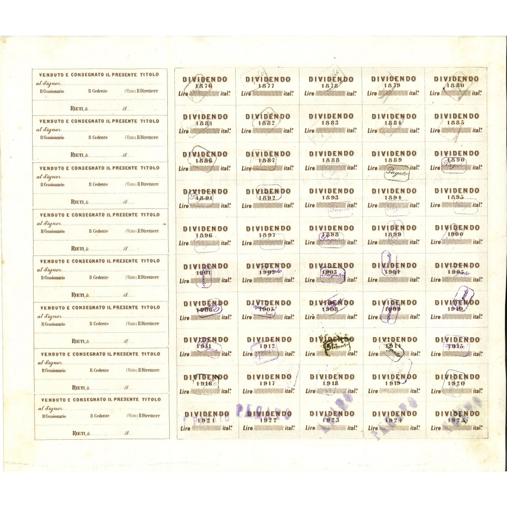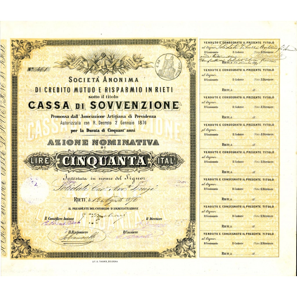 Storico titolo di grande valore, promosso dall'Associazione Artigiana di Previdenza. Autorizzata con Reale Decreto 2 Gennaio 1876 per la durata di 50 anni. Azione nominativa di Lire 50 (Cinquanta). Emessa a Rieti il 12 Agosto 1876