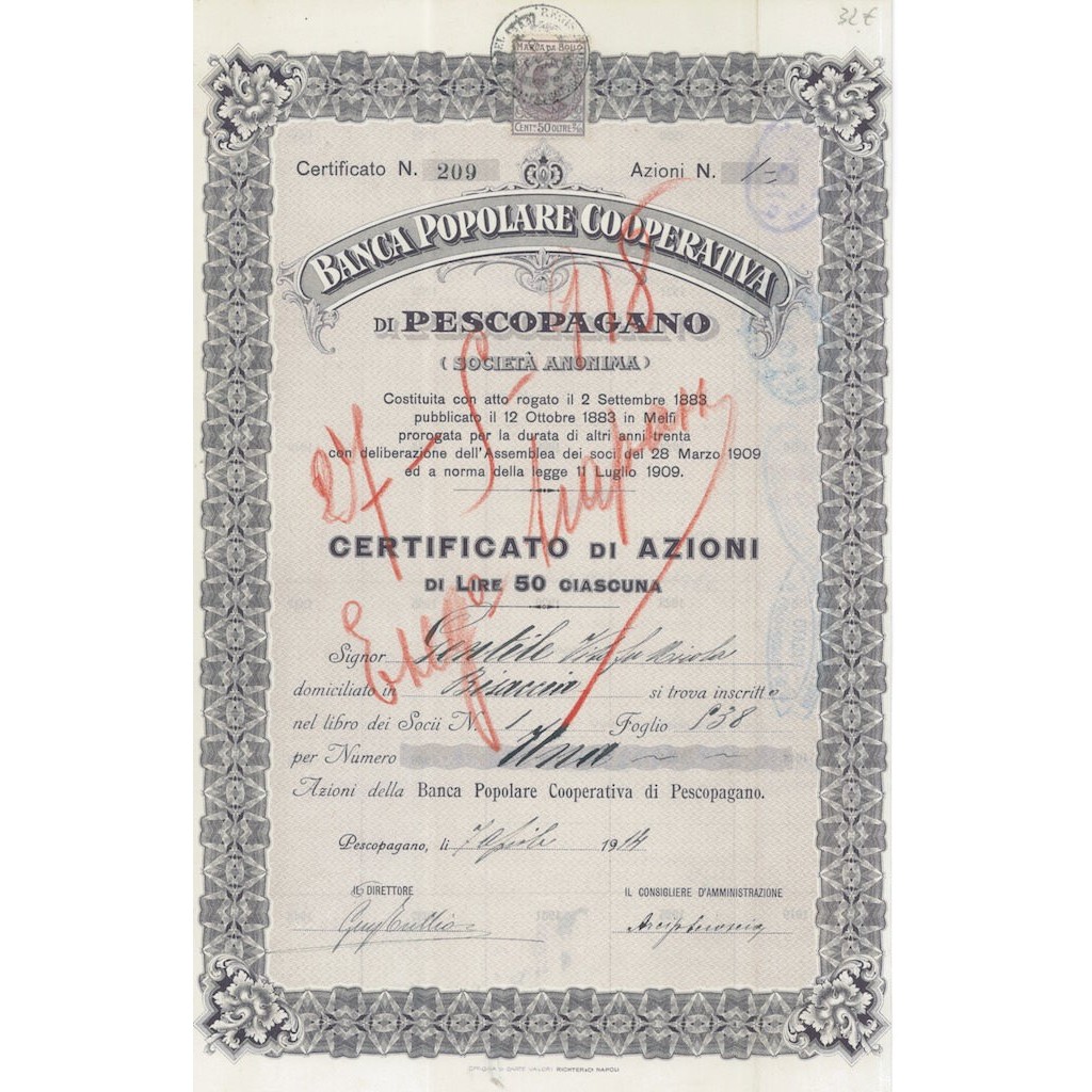 CERTIFICATO DI UNA AZIONE DA 50 LIRE CADAUNA