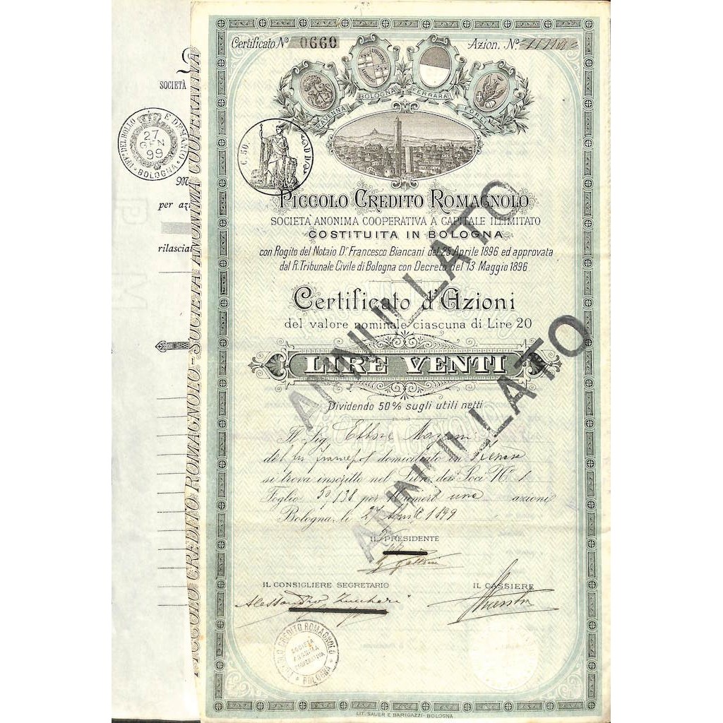 1899 - PICCOLO CREDITO ROMAGNOLO - 1 AZIONE BOLOGNA