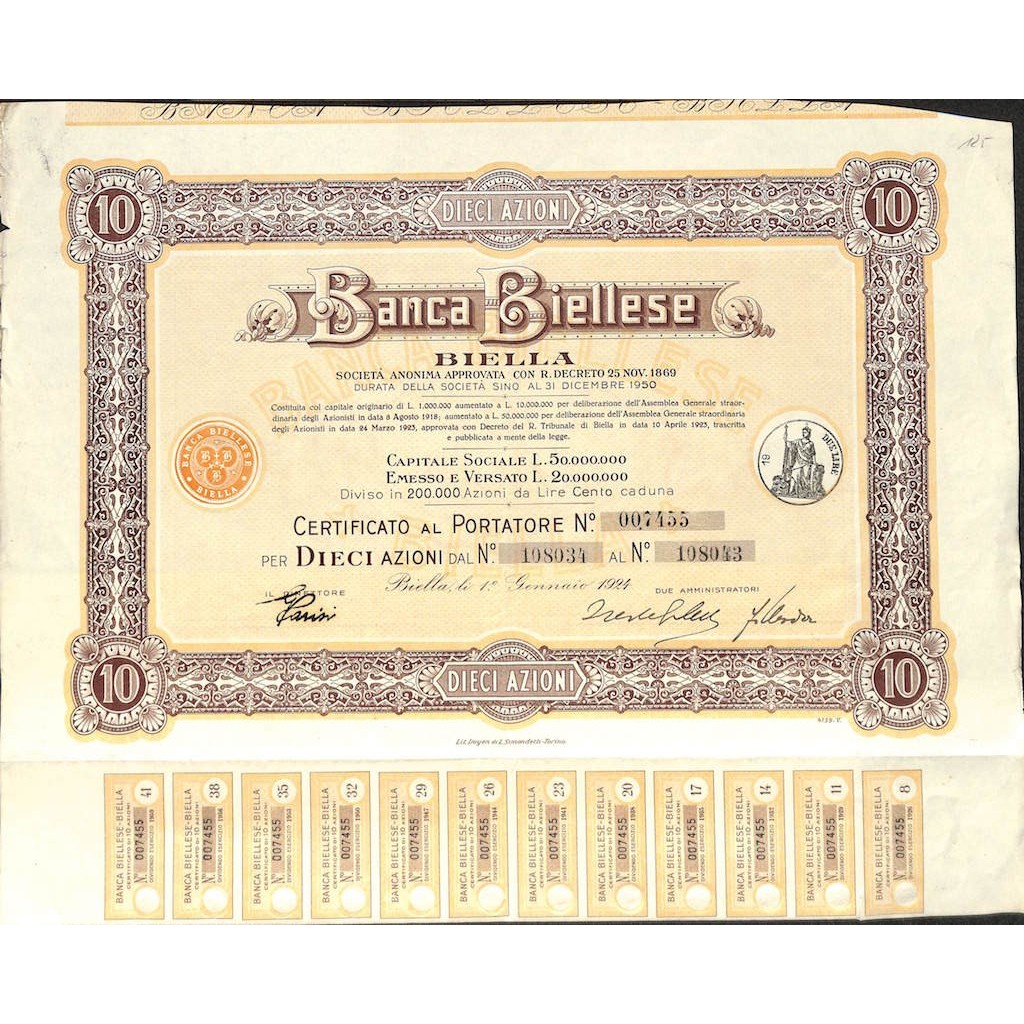BANCA BIELLESE - 10 AZIONI - BIELLA 1924