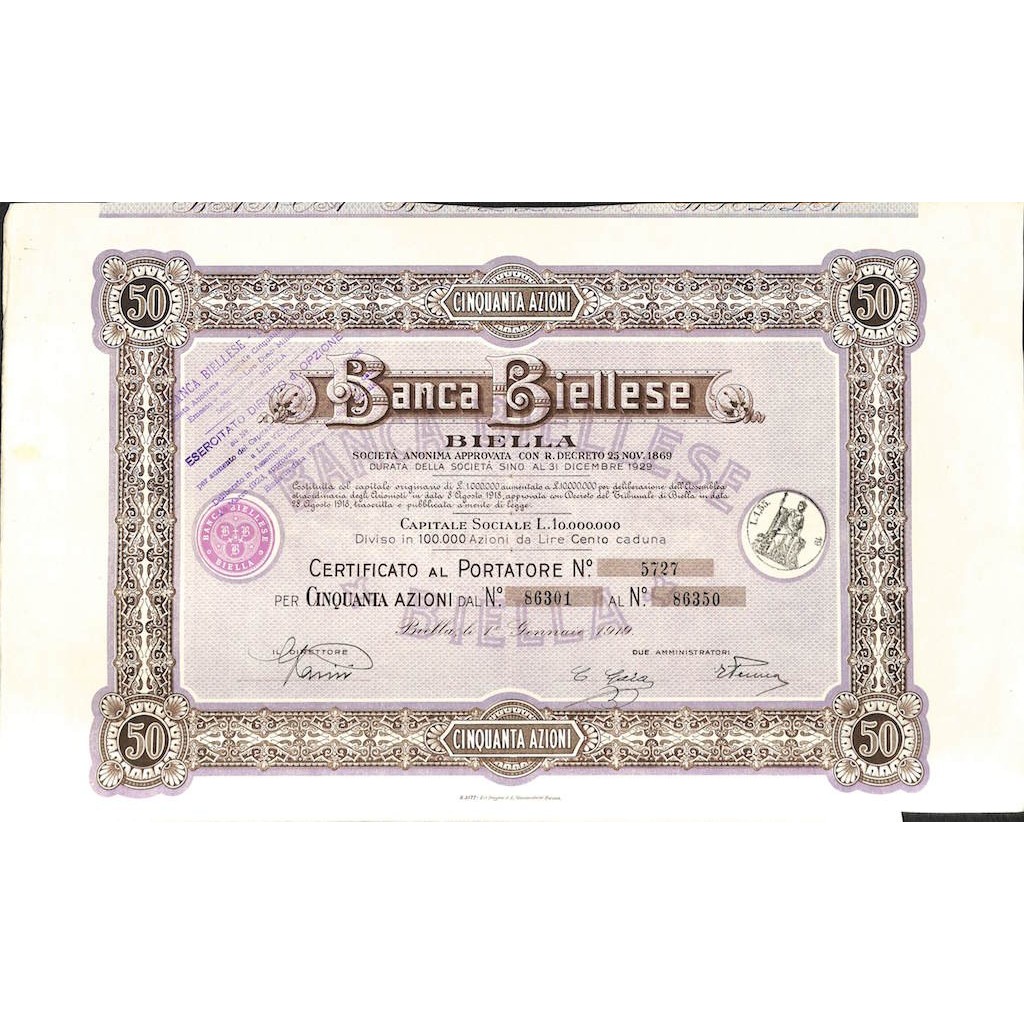 BANCA BIELLESE - 50 AZIONI - BIELLA 1919