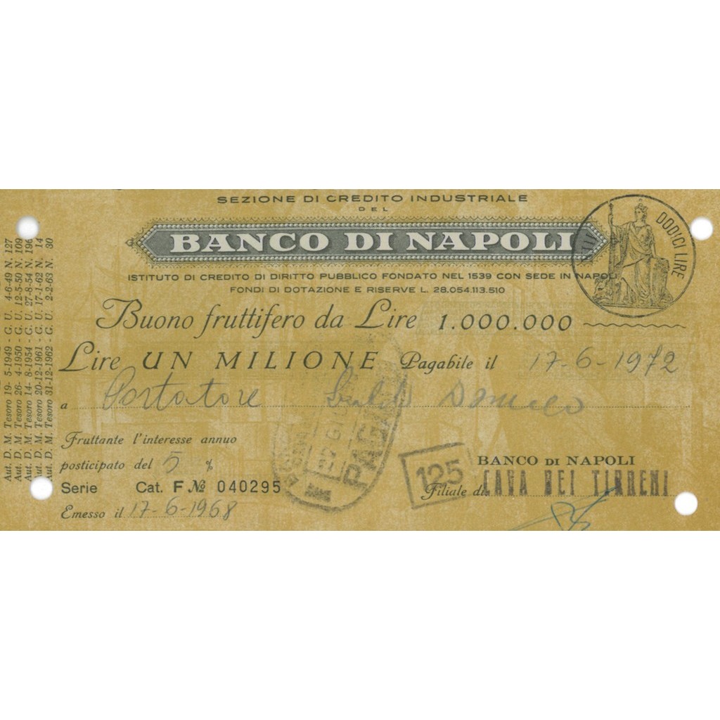 Buono fruttifero al portatore da lire 1 milione, fruttante l'interesse annuo posticipato del 5%.