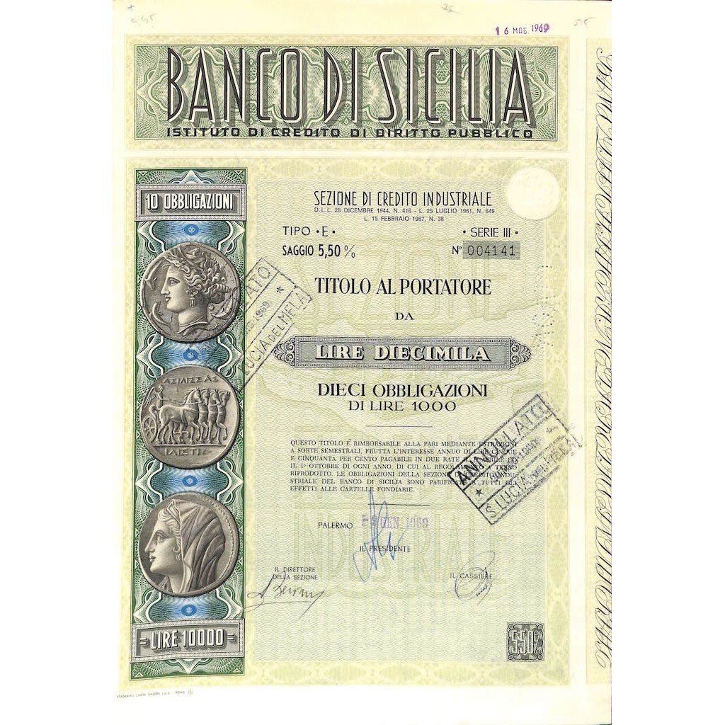 1969 - BANCO DI SICILIA - 10 OBBLIGAZIONI - PALERMO