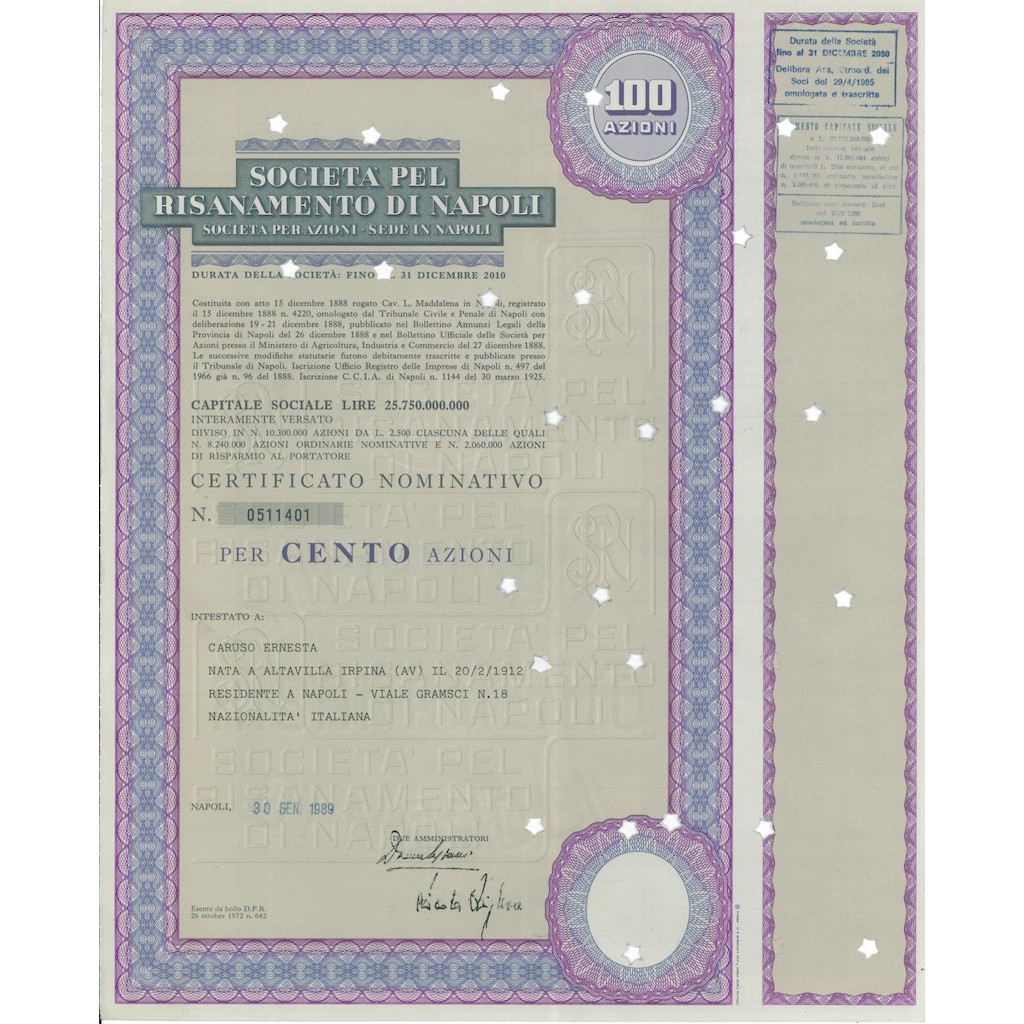 SOCIETÀ PEL RISANAMENTO DI NAPOLI 100 AZIONI NAPOLI 1972