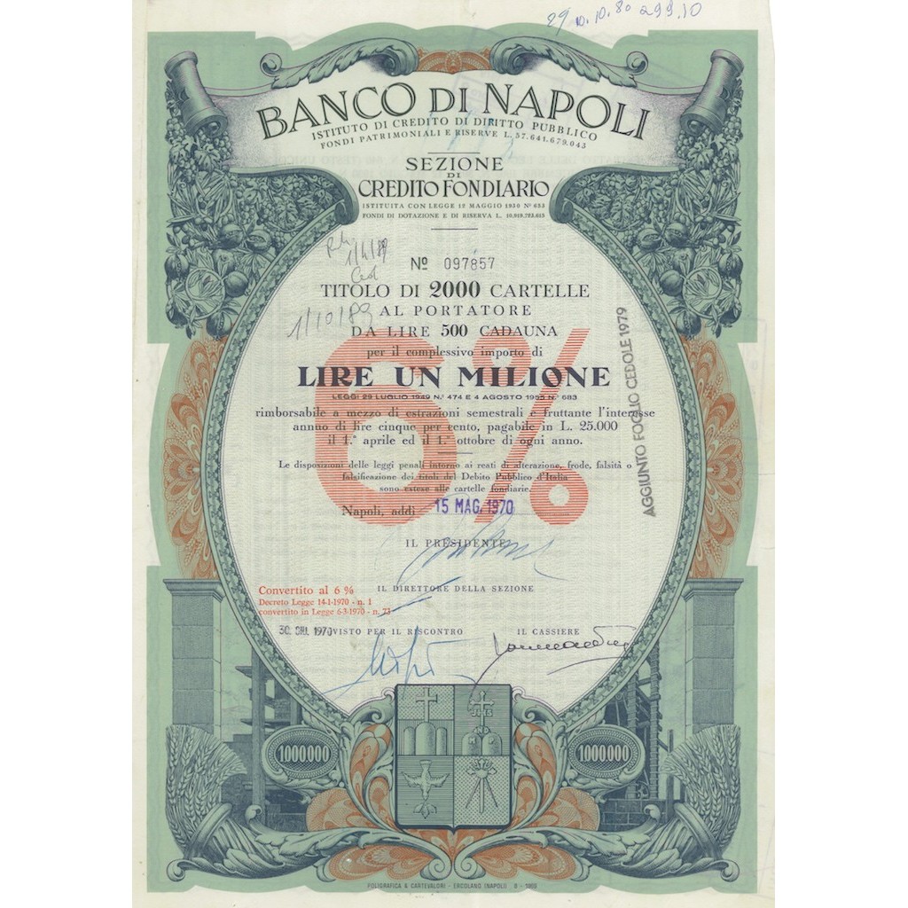Titolo di 2000 cartelle cadauna per un importo di lire un milione.