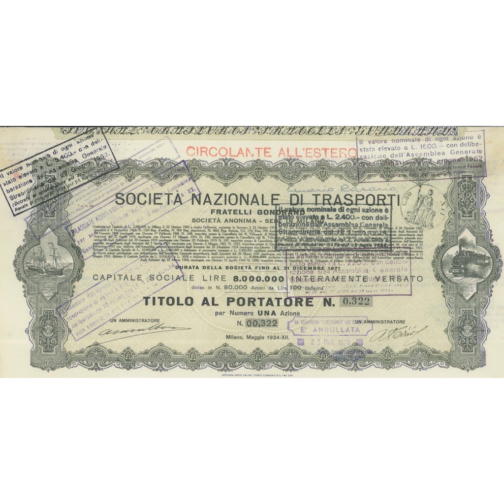 SOCIETÀ NAZIONALE DI TRASPORTI FRATELLI GONDRAND 1 AZIONE MILANO 1934