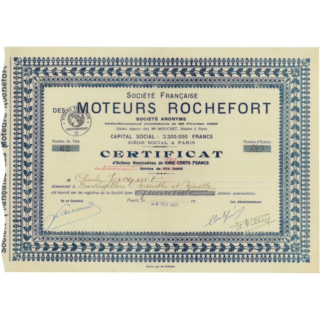 SOC. FRANCAISE DES MOTEURS ROCHEFORT - 40 AZIONI - 1927