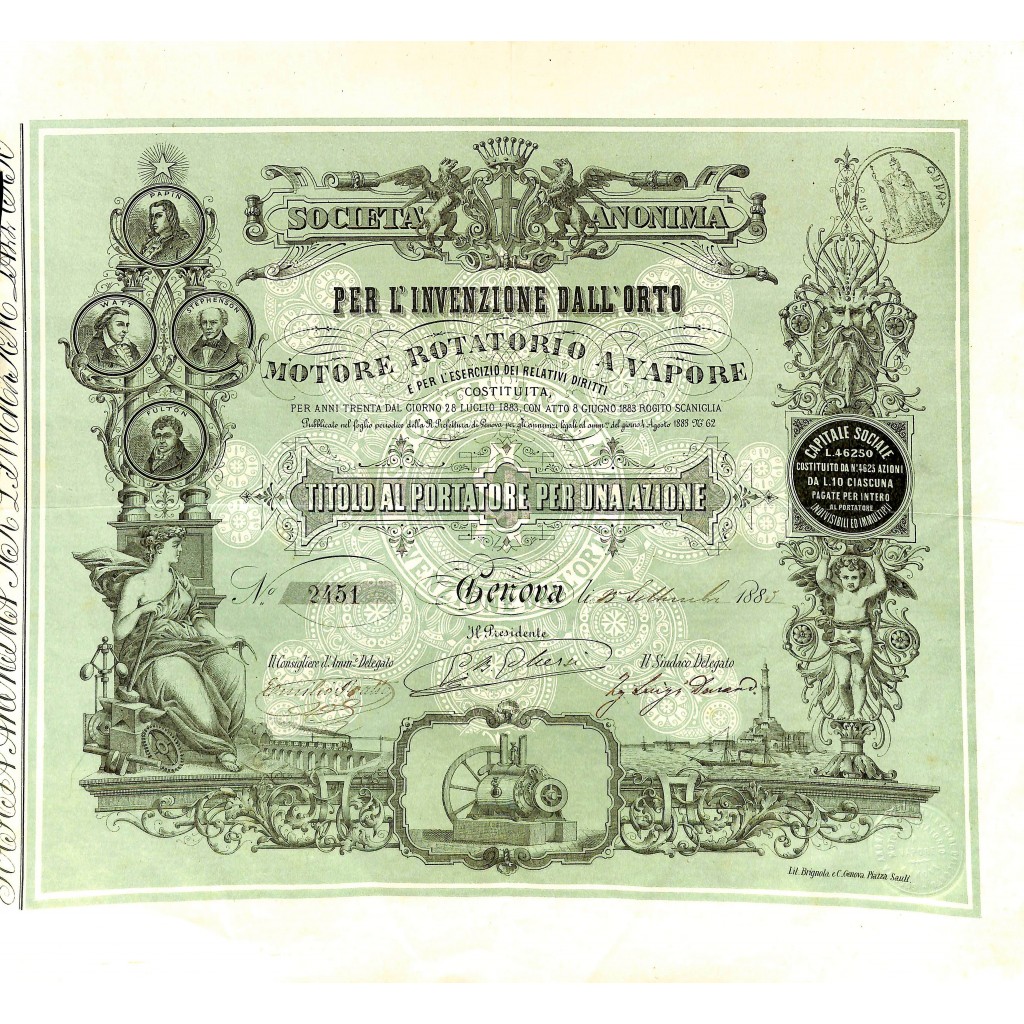 10 Lire bearer foundation action. Genoa 15 September 1883. The company had the purpose of marketing a rotary steam engine invented by the Italian Dall’Orto. The evocative graphic layout of the document offers an emblematic visual connection for the immediate identification of the company: the power of progress.