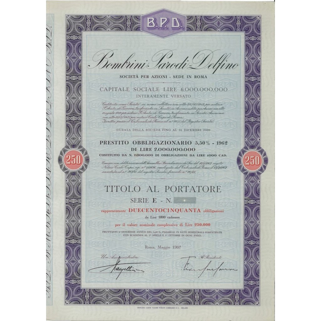 TITOLO AL PORTATORE PER 250 OBBLIGAZIONI