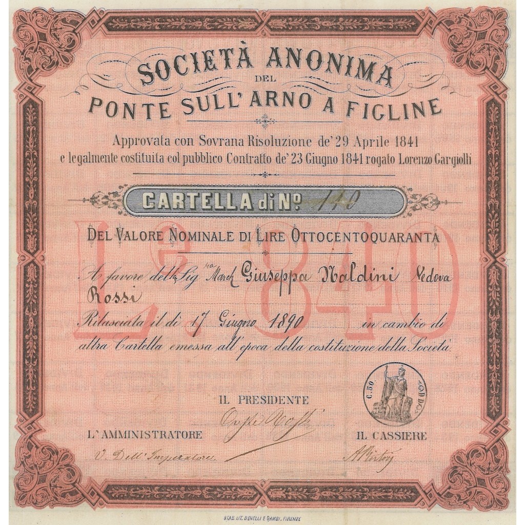 Il capitale della società, costituita nel 1841, fu diviso in 170 azioni portate successivamente a 200. Il ponte fu aperto all'esercizio il 20 Novembre 1843. Nel 1889 la ragione sociale mutò in Società Anonima del Ponte sull'Arno a Figline.