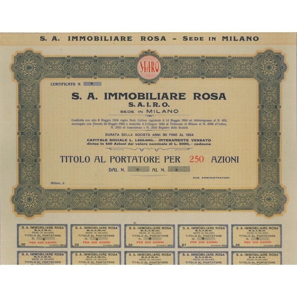 S.A. IMMOBILIARE ROSA - 250 AZIONI - MILANO 1924