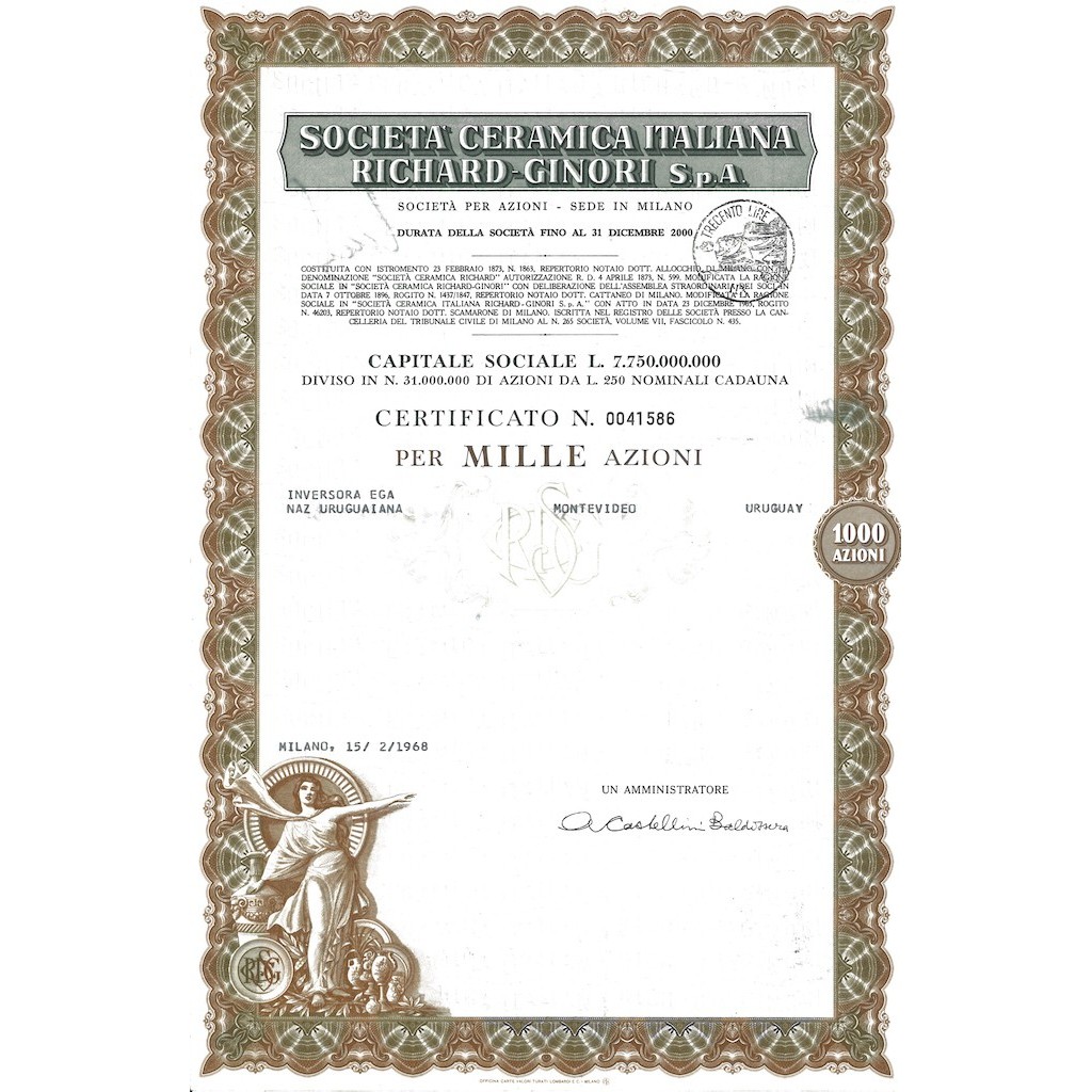 SOC. CERAMICA ITALIANA RICHARD-GINORI - 1000 AZIONI MILANO 1967