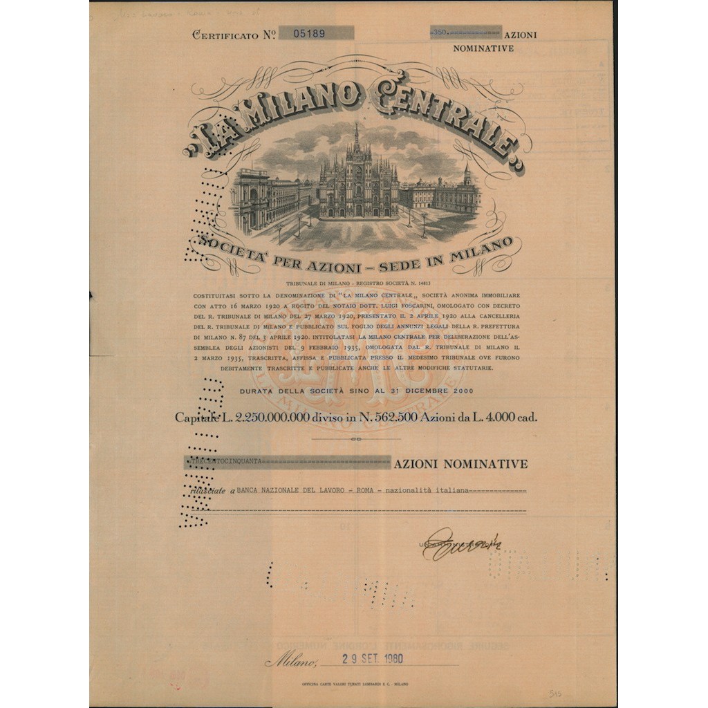 In asta un raro certificato nominativo emesso dalla "La Milano Centrale" - Società per Azioni, con sede a Milano, datato 29 settembre 1980. Il titolo rappresenta 350 azioni del valore nominale di 4.000 Lire ciascuna, ed è intestato alla Banca Nazionale del Lavoro - Roma.