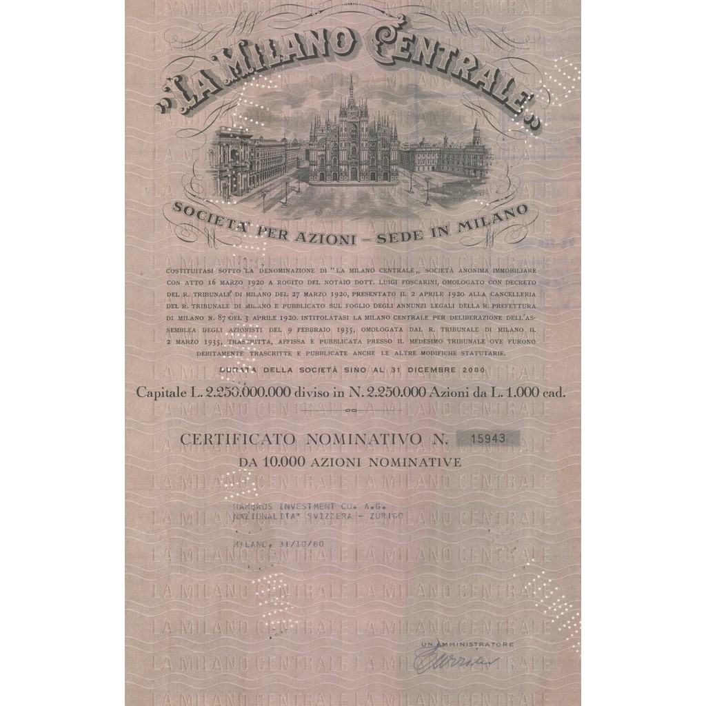 In asta un prestigioso e raro certificato nominativo emesso dalla "La Milano Centrale" - Società per Azioni, datato 31 ottobre 1980. Il certificato rappresenta 10.000 azioni nominative da 1.000 Lire ciascuna, intestato alla Markus Investment Co. A.G. con sede a Zurigo, Svizzera.