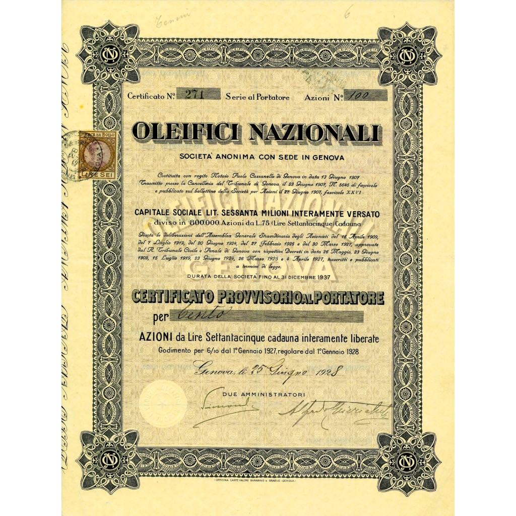 Dall'atto costitutivo si ricava che le due società affittarono alla Oleifici Nazionali i propri stabilimenti; in particolare la Oleificio Pavese mise a disposizione l'impianto di Livorno - con una superficie di 12.231 metri quadrati -, quello situato nell' allora comune autonomo di Sampierdarena e infine quello situato nel capoluogo pavese. La Nitrum, a sua volta, affittò le due fabbriche d'olio di Sampierdarena, una confinante con lo stabilimento della Ligure Lombarda per la raffinazione degli zuccheri* e l'altra con quello della Oleificio Pavese. Inoltre l'azienda genovese diede in locazione anche l'impianto a uso docks - di quasi 2.400 metri quadrati di superficie - e quella parte di macchinario che la Scerno e Gismondi aveva precedentemente affittato alla ditta Carlo Pastorino. Il fitto annuo degli inter complessi produttivi venne stabilito in 50.000 lire. Nel corso del 1928, la Oleifici Nazionali acquisi due aziende del settore: la Oleifici Triestini e la Oleifici Liguri Napoletani. Nel febbraio del 1931, tuttavia, la società venne posta in liquidazione.