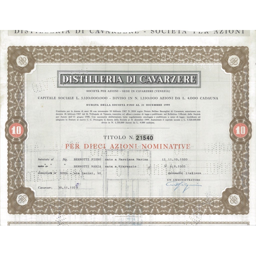 DISTILLERIE DI CAVARZERE - 10 AZIONI CAVARZERE 1973