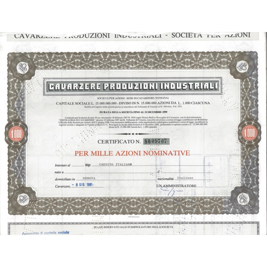 DISTILLERIE DI CAVARZERE - 1000 AZIONI CAVARZERE 1981