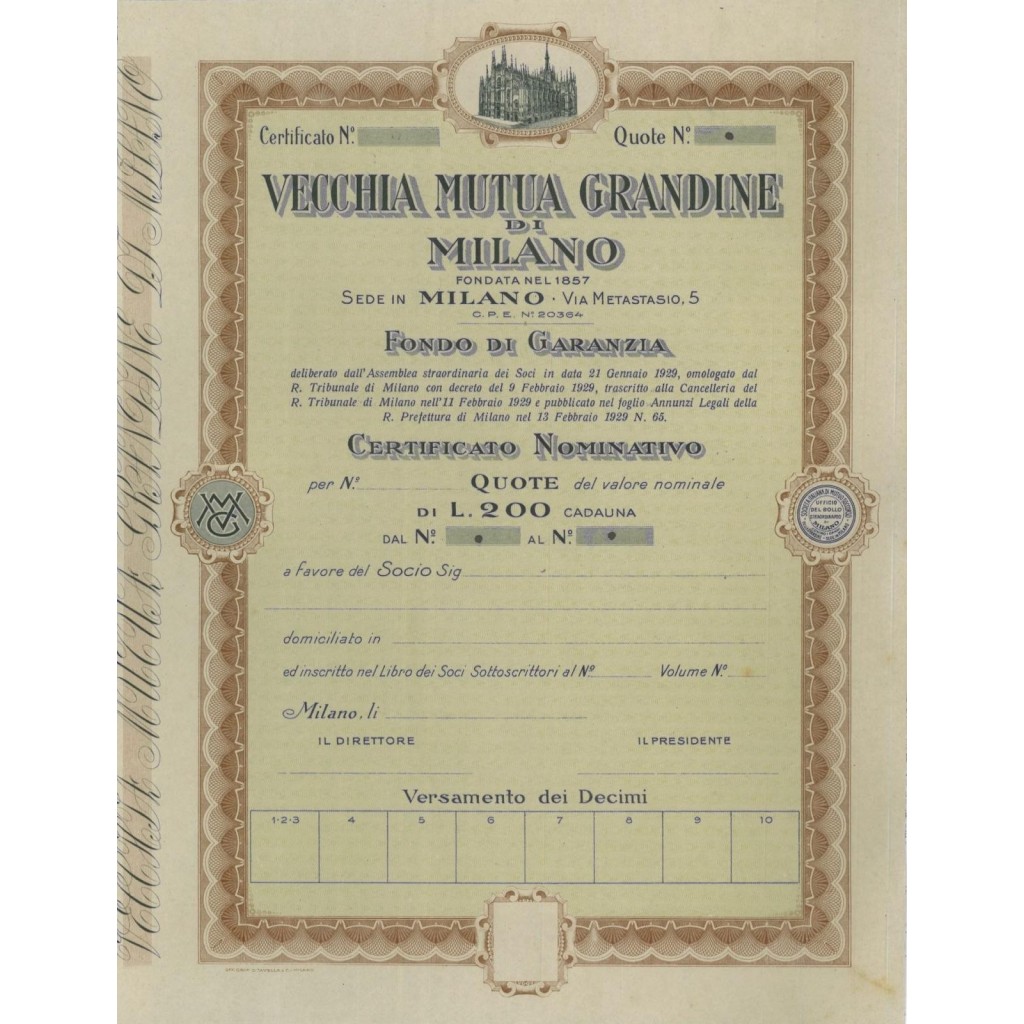 VECCHIA MUTUA GRANDINE DI MILANO - QUOTE - 1929