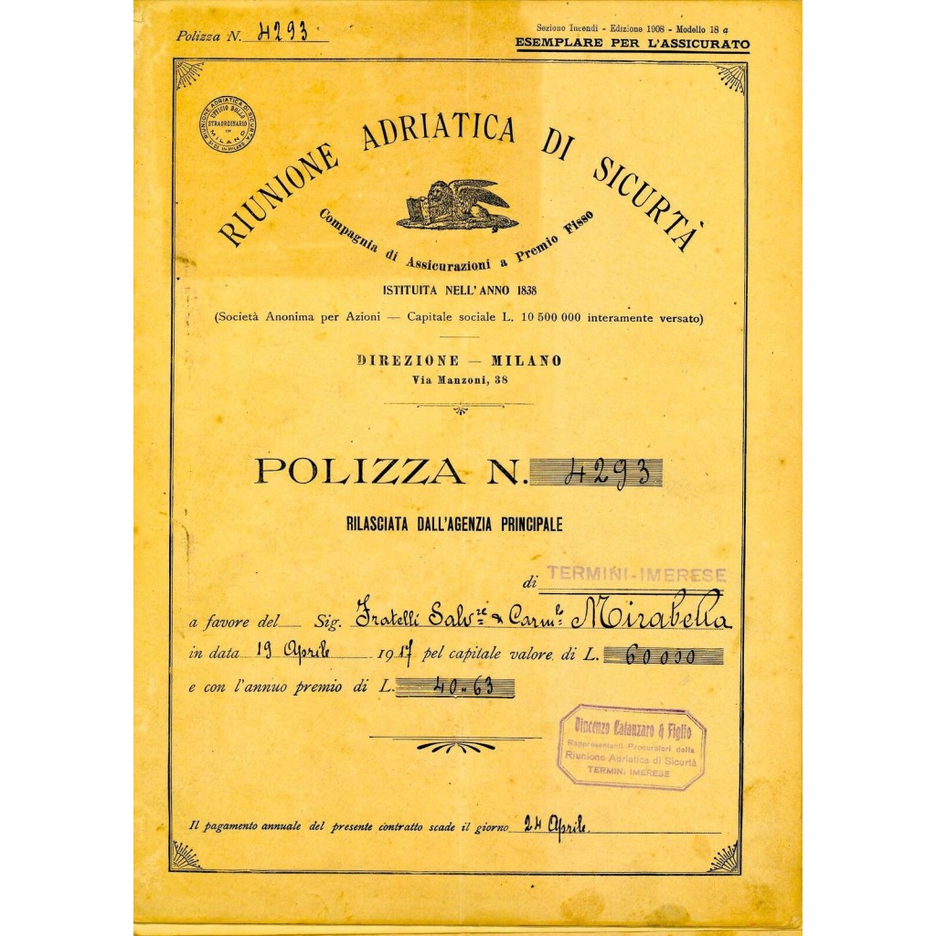 1917 - RAS RIUNIONE ADRIATICA DI SICURTA' - INCENDIO - TERMINI IMERESE