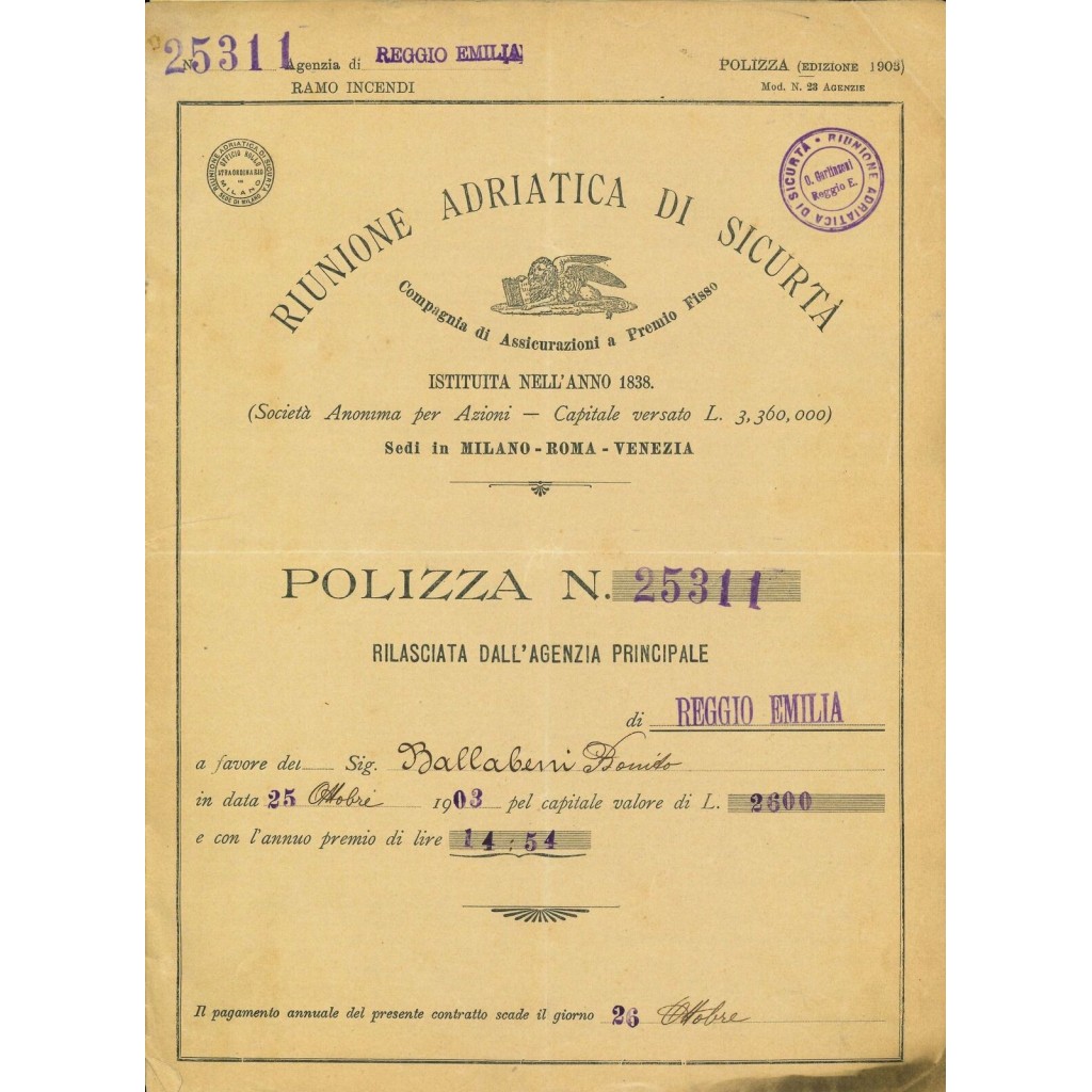 1903 - RAS RIUNIONE ADRIATICA DI SICURTA' - INCENDIO - REGGIO EMILIA