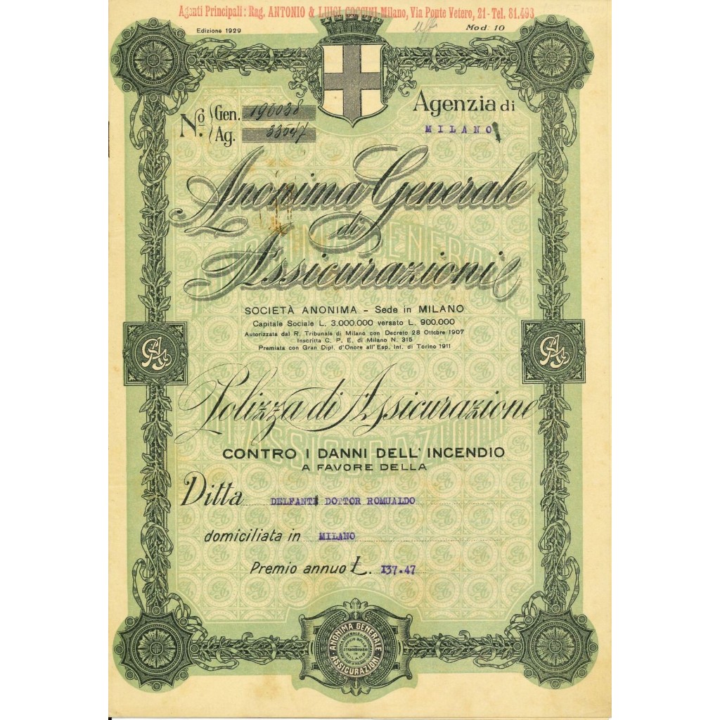1931 - ANONIMA GENERALE DI ASSICURAZIONI - INCENDIO - MILANO