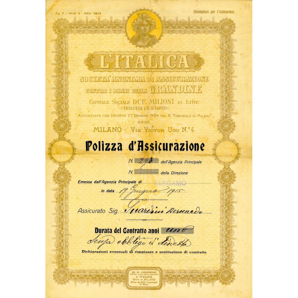 1915 - L'ITALICA SOCIETA' ANONIMA DI ASSICURAZIONE - GRANDINE - BERGAMO