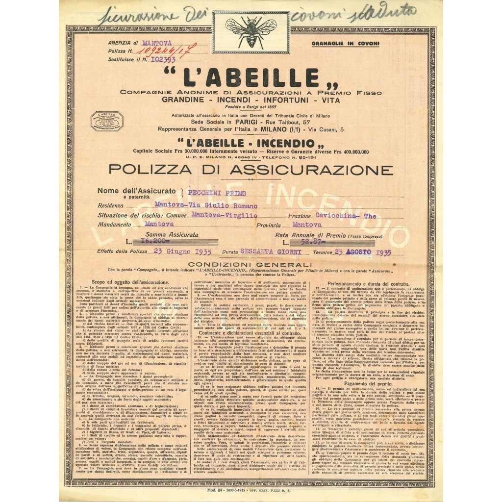 1935 - L'ABEILLE - INCENDIO - MANTOVA