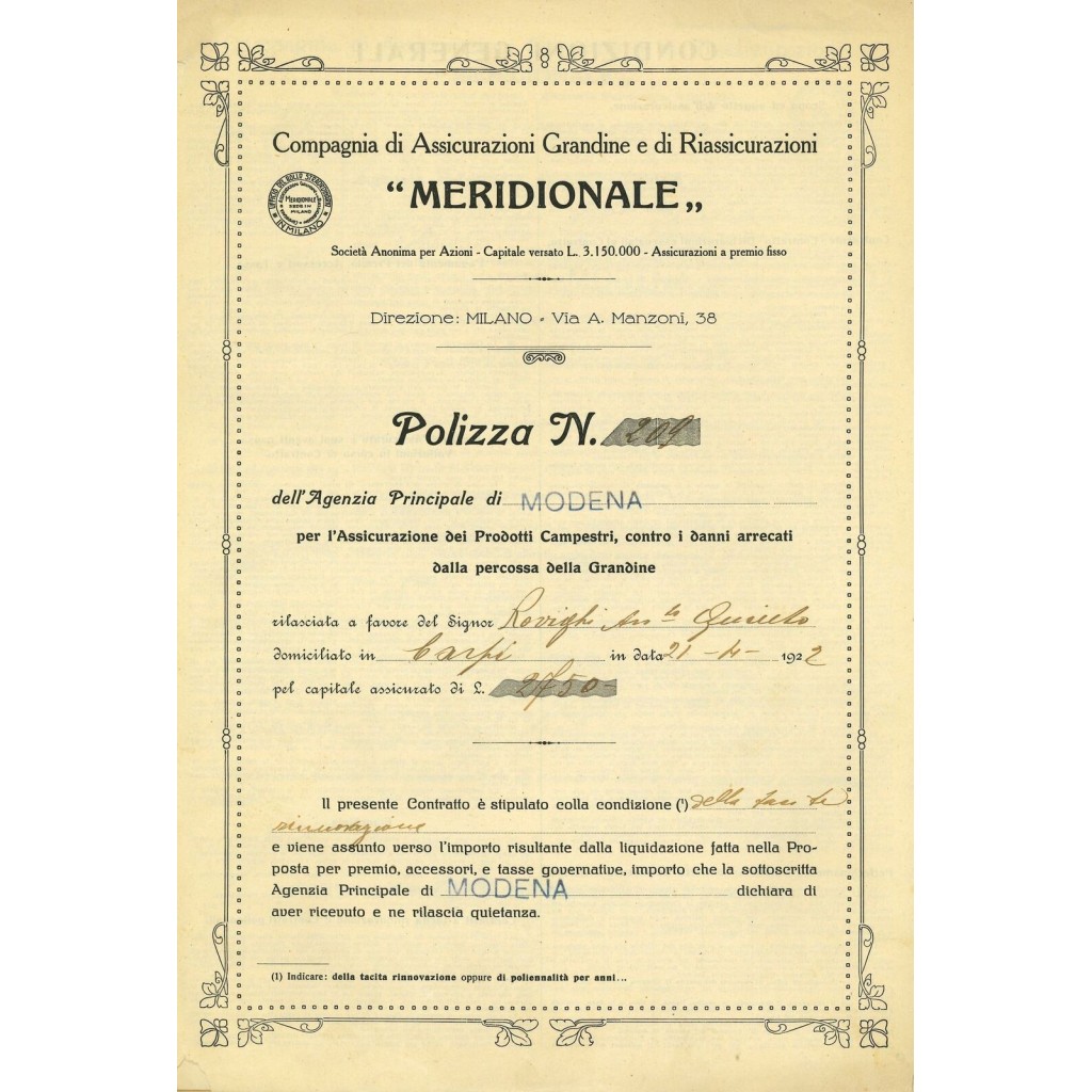 1922 - MERIDIONALE - GRANDINE - MODENA