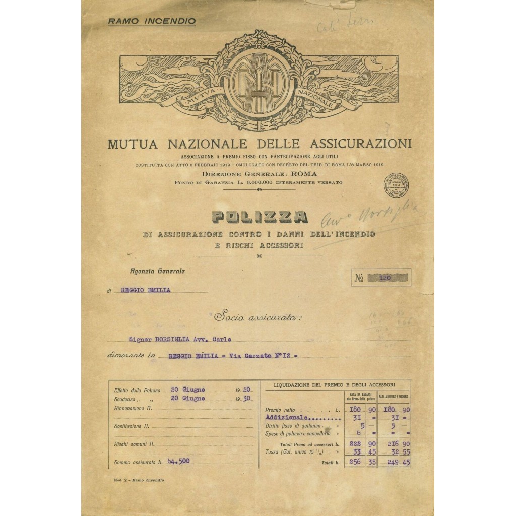 1920 - MUTUA NAZIONALE DELLE ASSICURAZIONI - INCENDIO - REGGIO EMILIA
