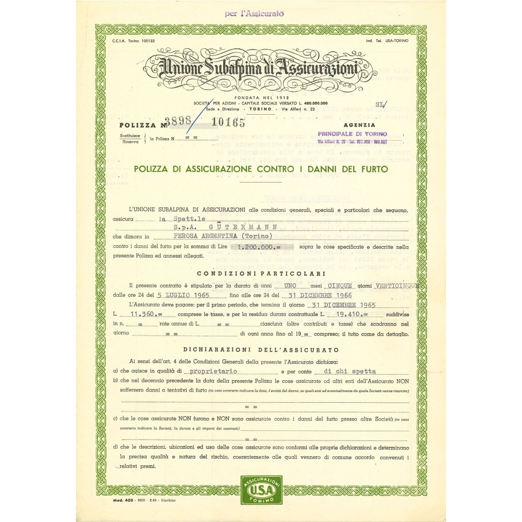 1965 - UNIONE SUBALPINA DI ASSICURAZIONI - FURTO - TORINO