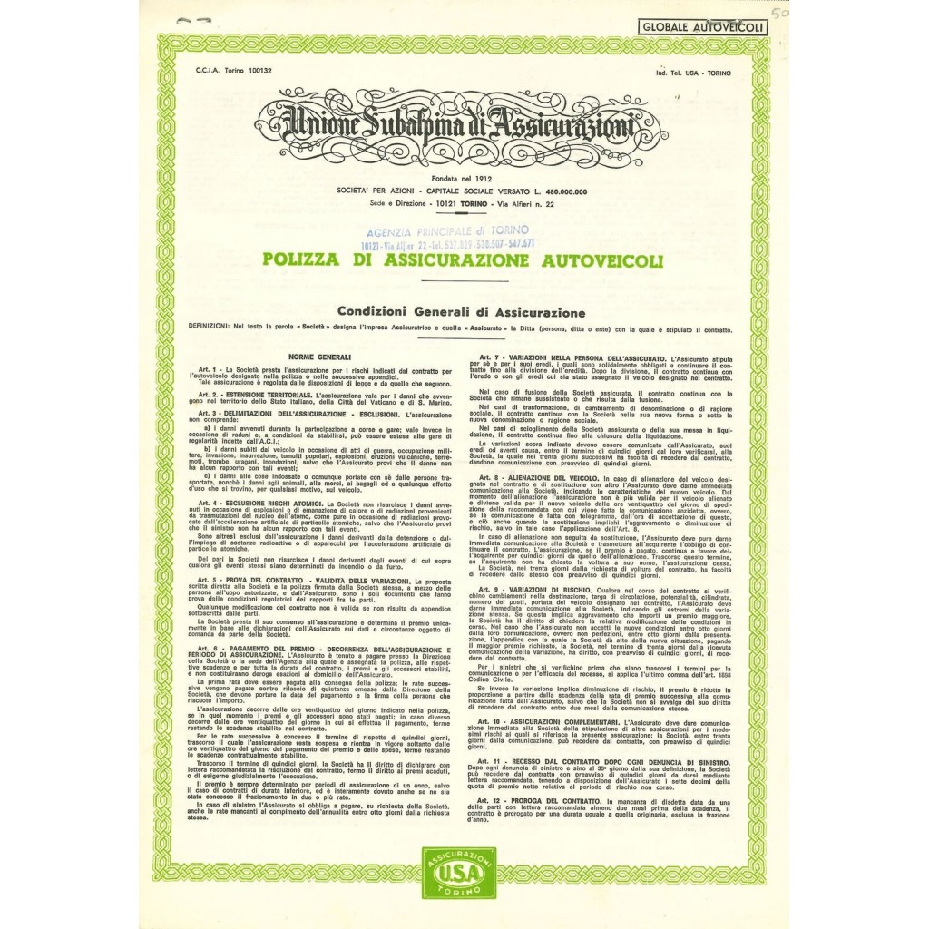 1960 - UNIONE SUBALPINA DI ASSICURAZIONI - AUTOVEICOLI - TORINO