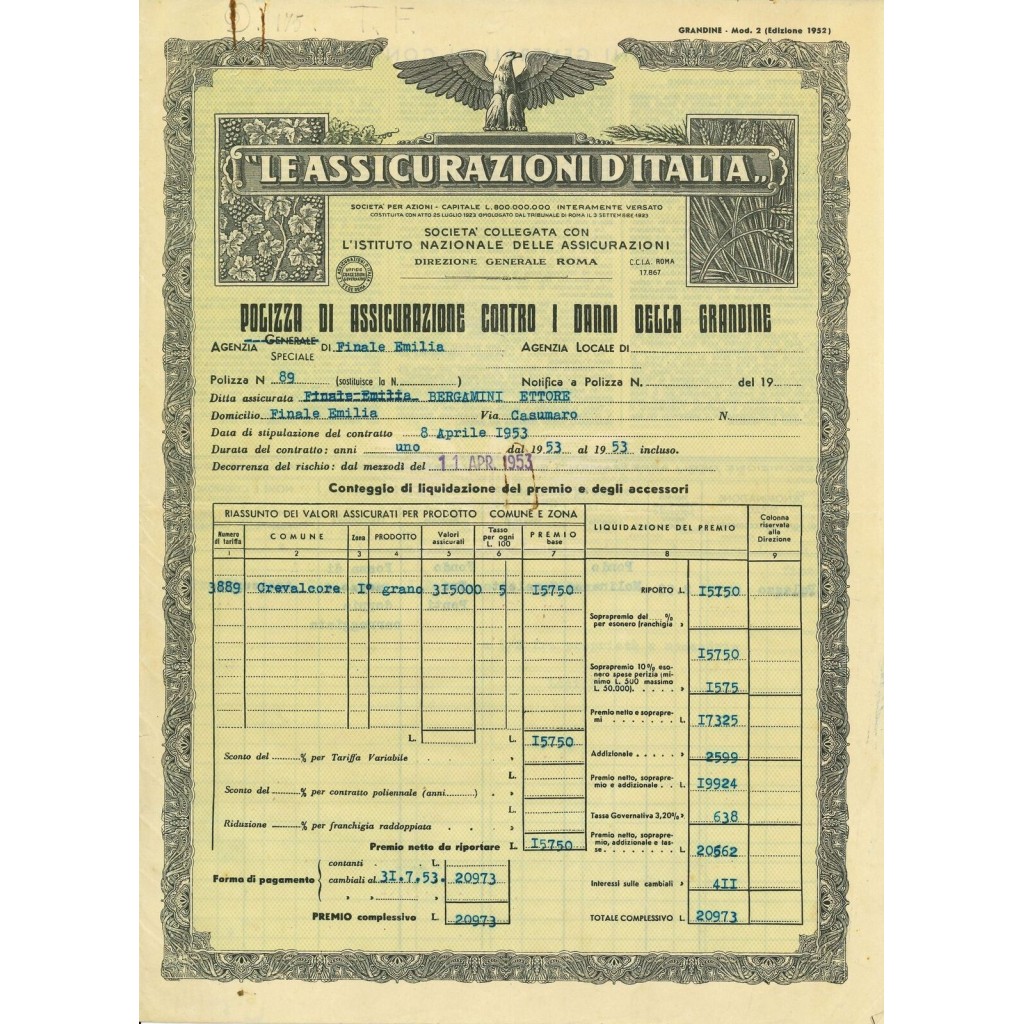 1953 - LE ASSICURAZIONI D'ITALIA - GRANDINE - FINALE EMILIA