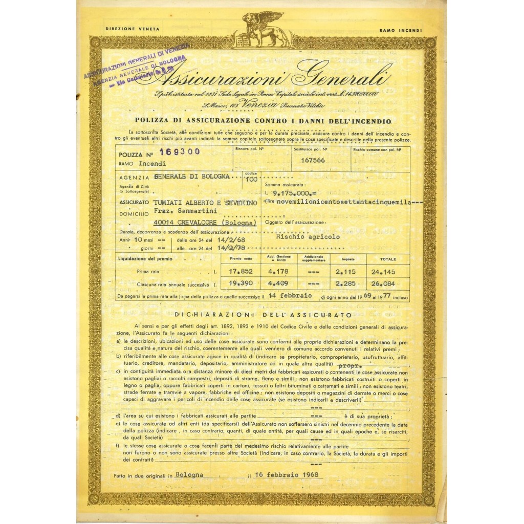 1968 - ASSICURAZIONI GENERALI - INCENDIO - BOLOGNA