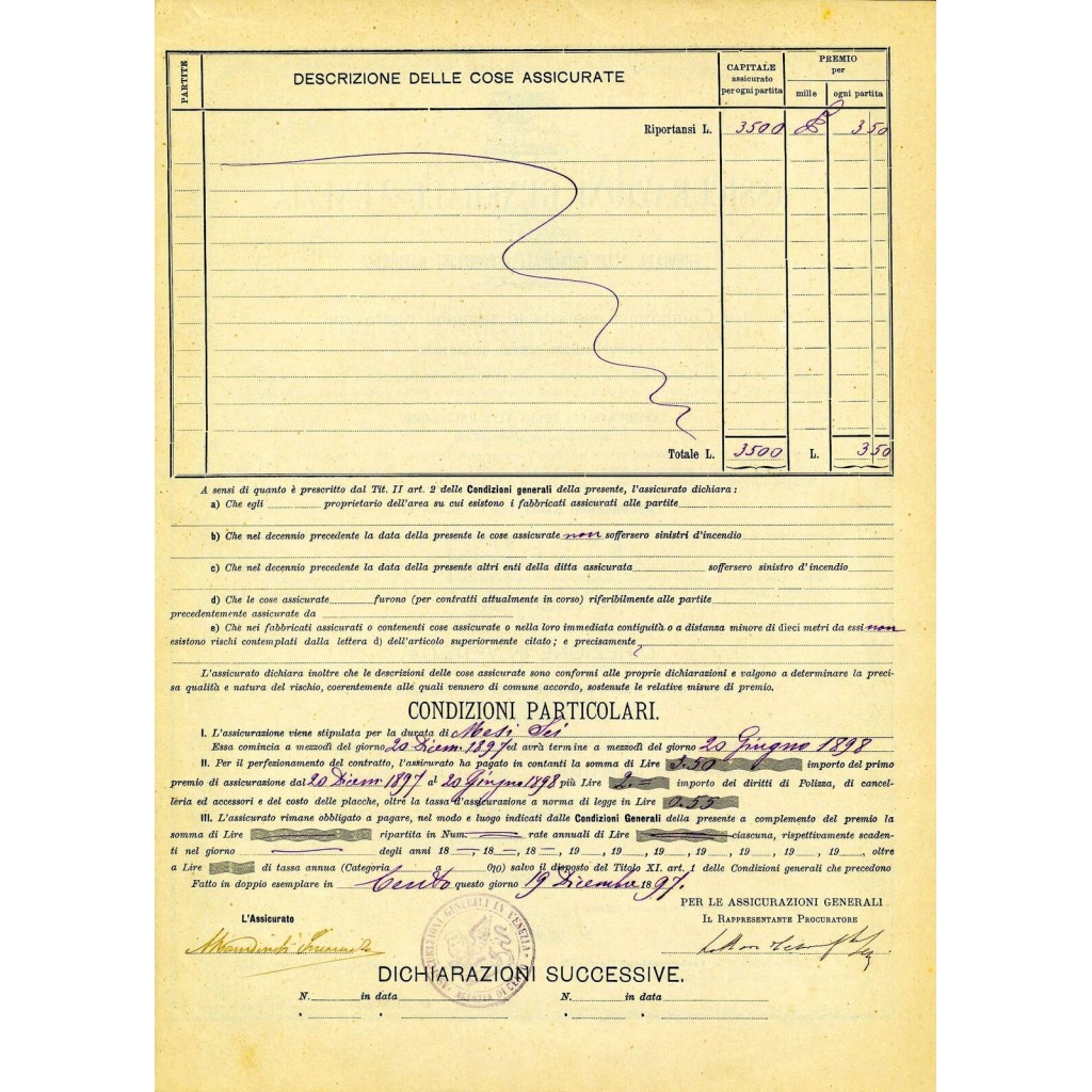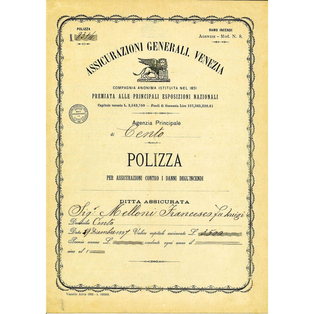 1897 - ASSICURAZIONI GENERALI DI VENEZIA - INCENDIO - CENTO