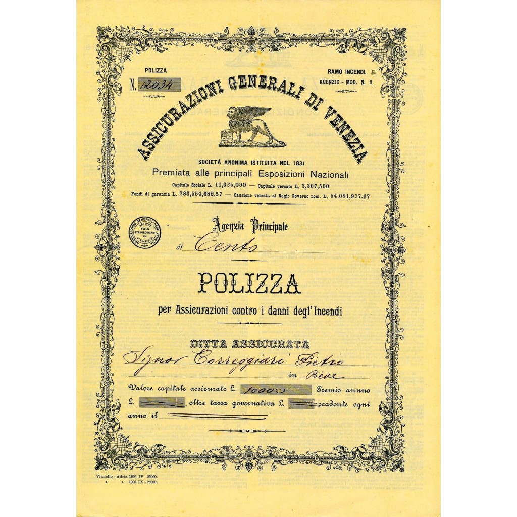 1906 - ASSICURAZIONI GENERALI DI VENEZIA - INCENDIO - CENTO
