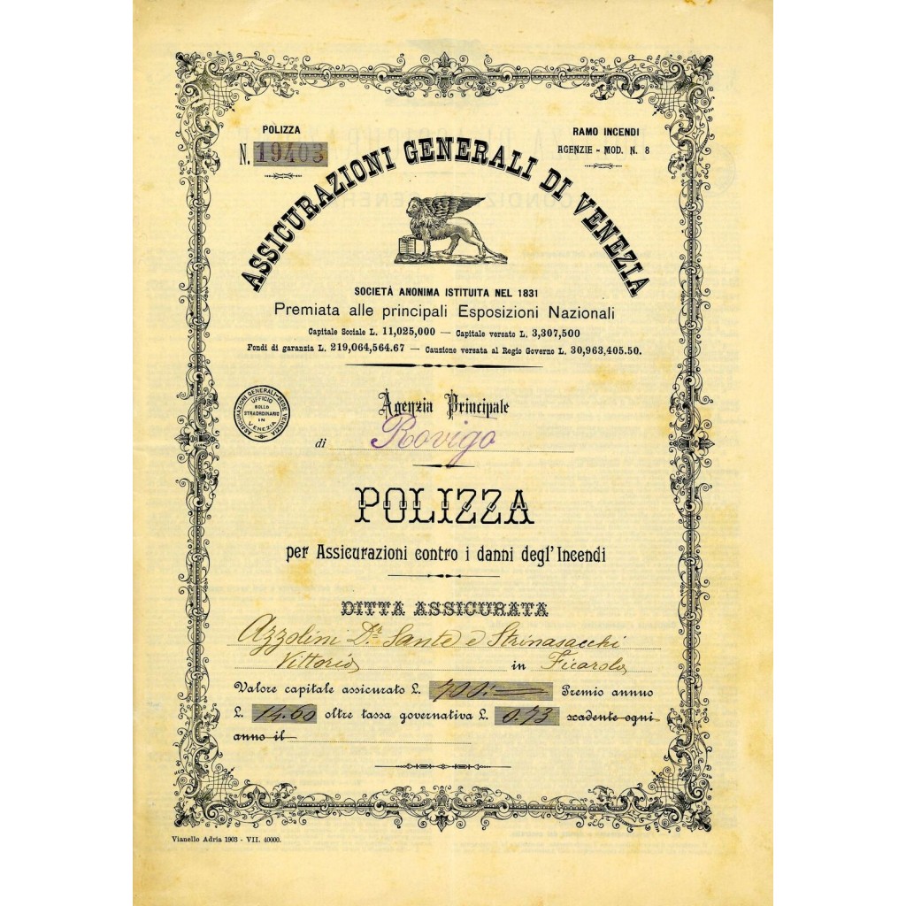 1903 - ASSICURAZIONI GENERALI DI VENEZIA - INCENDIO - ROVIGO