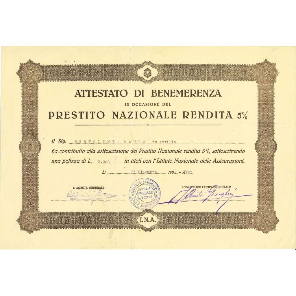 1935 - ISTITUTO NAZIONALE DELLE ASSICURAZIONI - ATTESTATO DI BENEMERENZA - MODENA
