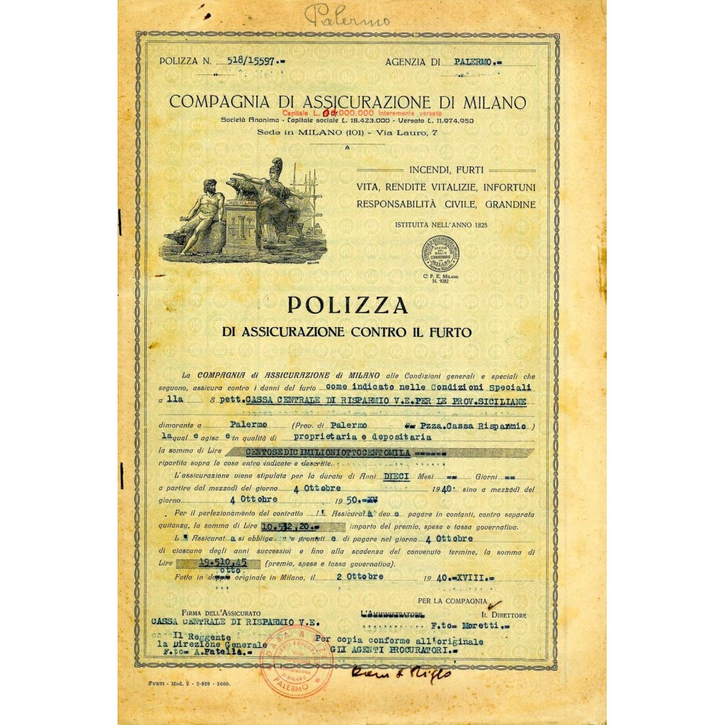 1940 - COMPAGNIA DI ASSICURAZIONE DI MILANO - FURTO - PALERMO