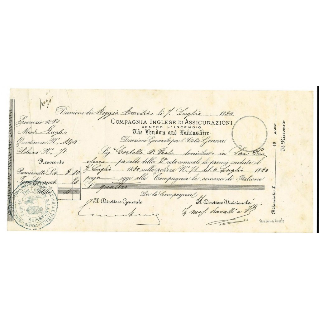 1880 - COMPAGNIA INGLESE DI ASSICURAZIONI - INCENDIO - REGGIO EMILIA
