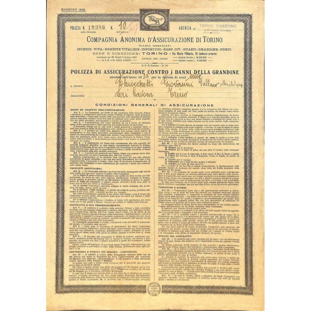 1932 - COMPAGNIA ANONIMA D'ASSICURAZIONE DI TORINO - POLIZZA DI ASS. CONTRO I DANNI DELLA GRANDINE