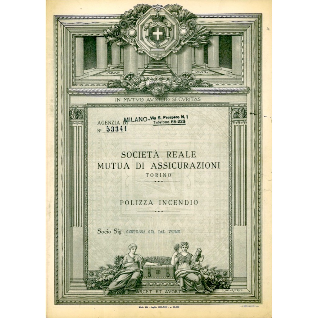 Documento di particolare rarità dell'emissione dell'assicurazione Incendio della Soc. Reale Mutua di Assicurazioni di Torino. Illustrato dall'artista G. Salvestrini. Splendida grafica con stemma centrale sabaudo immagini storici con lo slogan "In MVTVO AVXILIO SECVRITAS" Completa in tutte le sue pagine.