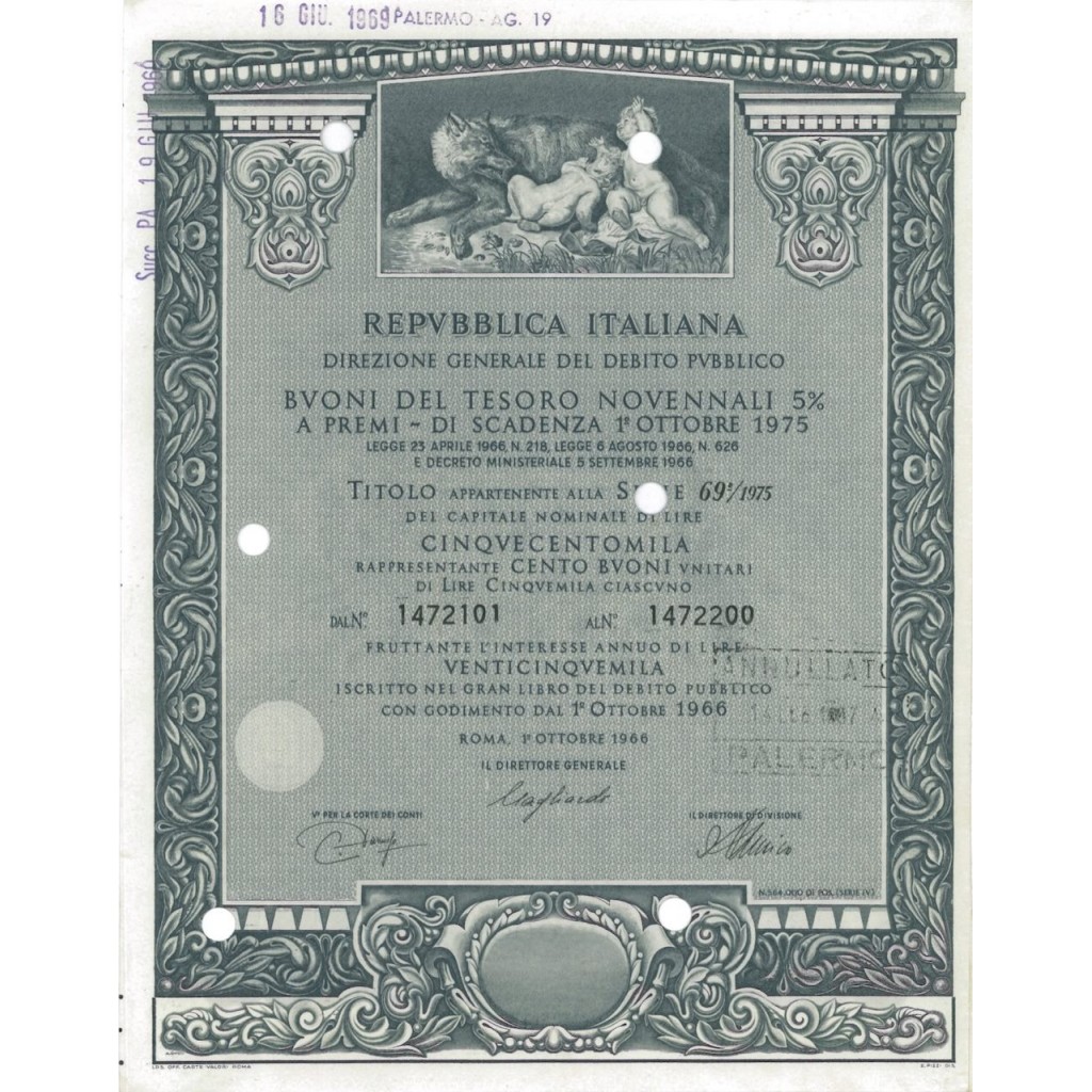 The five-year Treasury Bills at 5% bearer premiums issued by the Italian Republic under Law No. 218 of 23 April 1966 and Law No. 626 of 6 August 1966 and Ministerial Decree of 5 September 1966 are financial instruments issued by the Italian government to finance its activities. These bonds were designed by E. Pizzi and engraved by A. Quiti. Moreover, the image on the bonds is taken from the painting by P. Paolo Rubens entitled 'Romulus and Remus being fed by the she-wolf'.