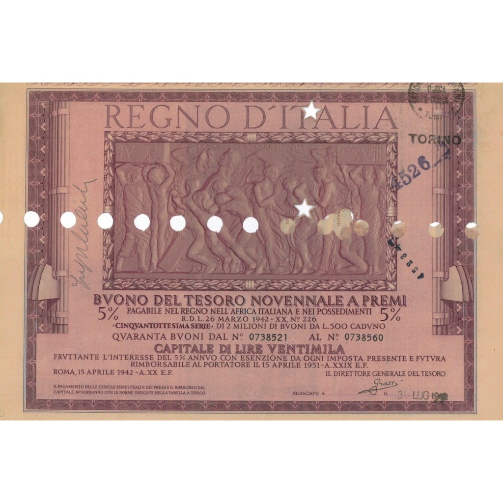 Have you ever dreamed of owning a piece of financial history? Now you have the opportunity to do so with the prestigious five-year, five per cent premium Treasury bonds issued in the Kingdom of Italy as National and War Loans, under Royal Decree-Law No. 226 of 26 March 1942 - XX. Now is the perfect time to dive into this fascinating financial adventure!