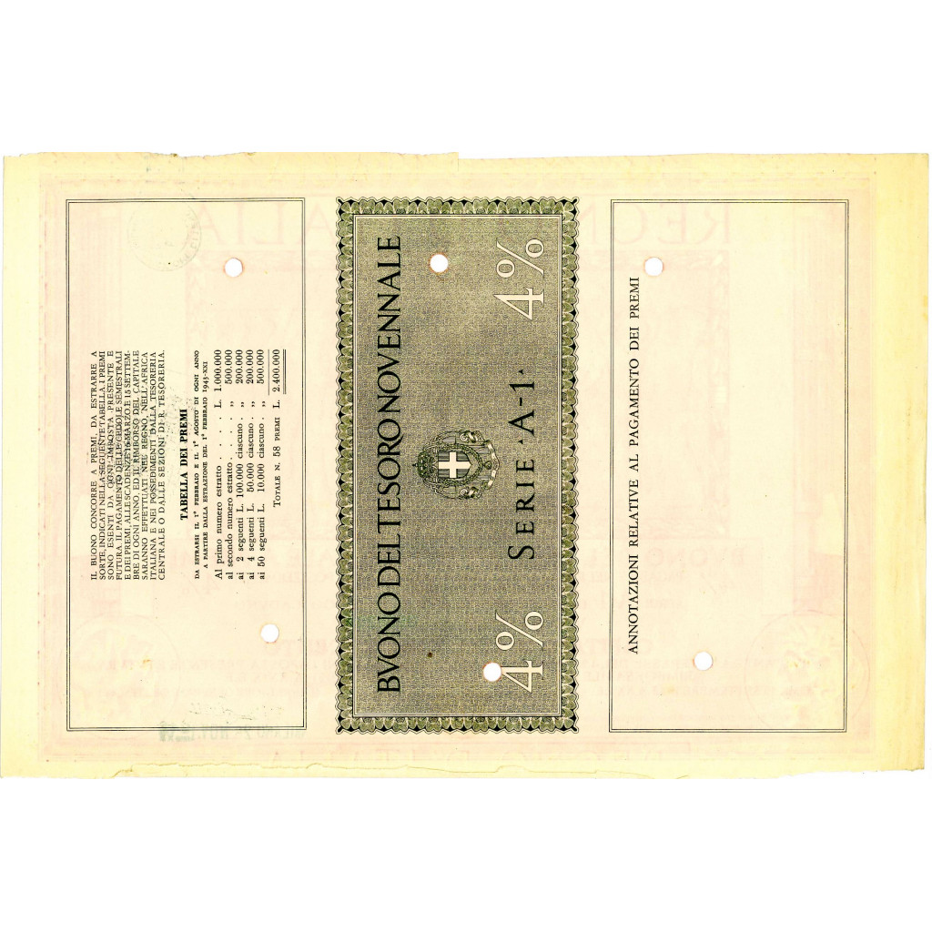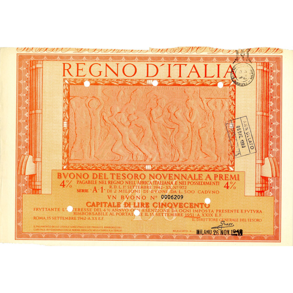 Have you ever dreamed of owning a piece of financial history? Now you have the opportunity to do so with the prestigious 4% nine-year Treasury Bonds issued in the Kingdom of Italy as National and War Loans, under Royal Decree-Law No. 971 of 1 September 1942 - XX. Now is the perfect time to dive into this fascinating financial adventure!