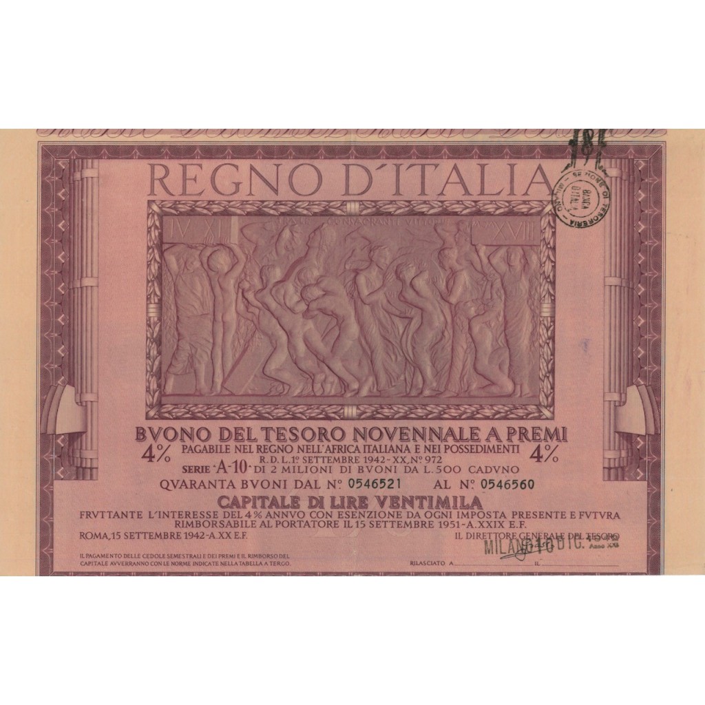 1942 /09 - BUONO DEL TESORO NOVENNALE A PREMI 4% LIRE 20.000 - ROMA