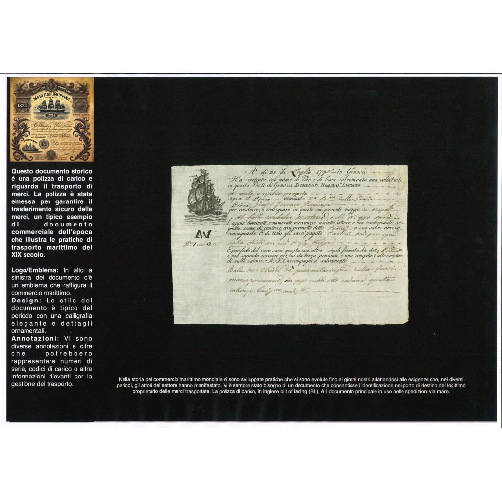 This historical document dates back to 1795 - POLIZZA DI CARICO DA GENOVA A NAPOLI The bill of lading is a document issued by the captain of a ship as a receipt for the goods loaded on board and includes a commitment to transport and deliver them to the indicated destination.