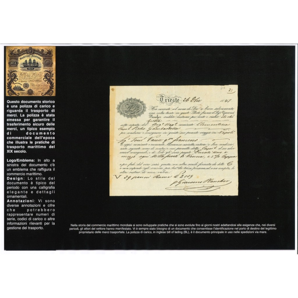 This historical document dates back to 1847 - POLIZZA DI CARICO DA TRIESTE A NAPOLI The bill of lading is a document issued by the captain of a ship as a receipt for the goods loaded on board and includes a commitment to transport and deliver them to the indicated destination.