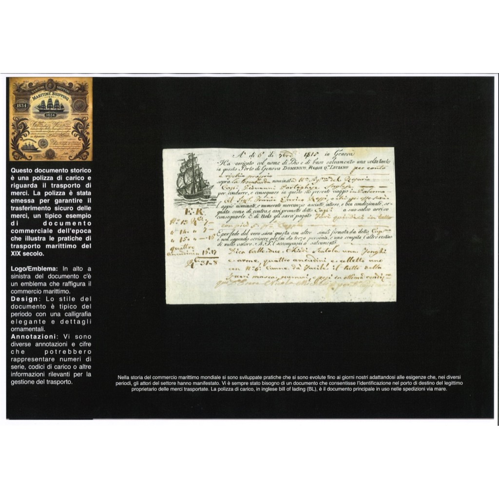 This historical document dates back to 1815 - POLIZZA DI CARICO DA GENOVA A PALERMO The bill of lading is a document issued by the captain of a ship as a receipt for the goods loaded on board and includes a commitment to transport and deliver them to the indicated destination.