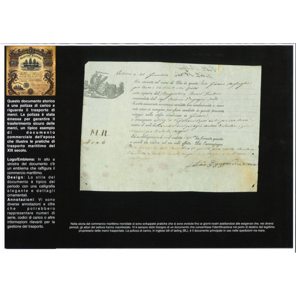 This historical document dates back to 1836 - POLIZZA DI CARICO DA PALERMO A GENOVA The bill of lading is a document issued by the captain of a ship as a receipt for the goods loaded on board and includes a commitment to transport and deliver them to the indicated destination.
