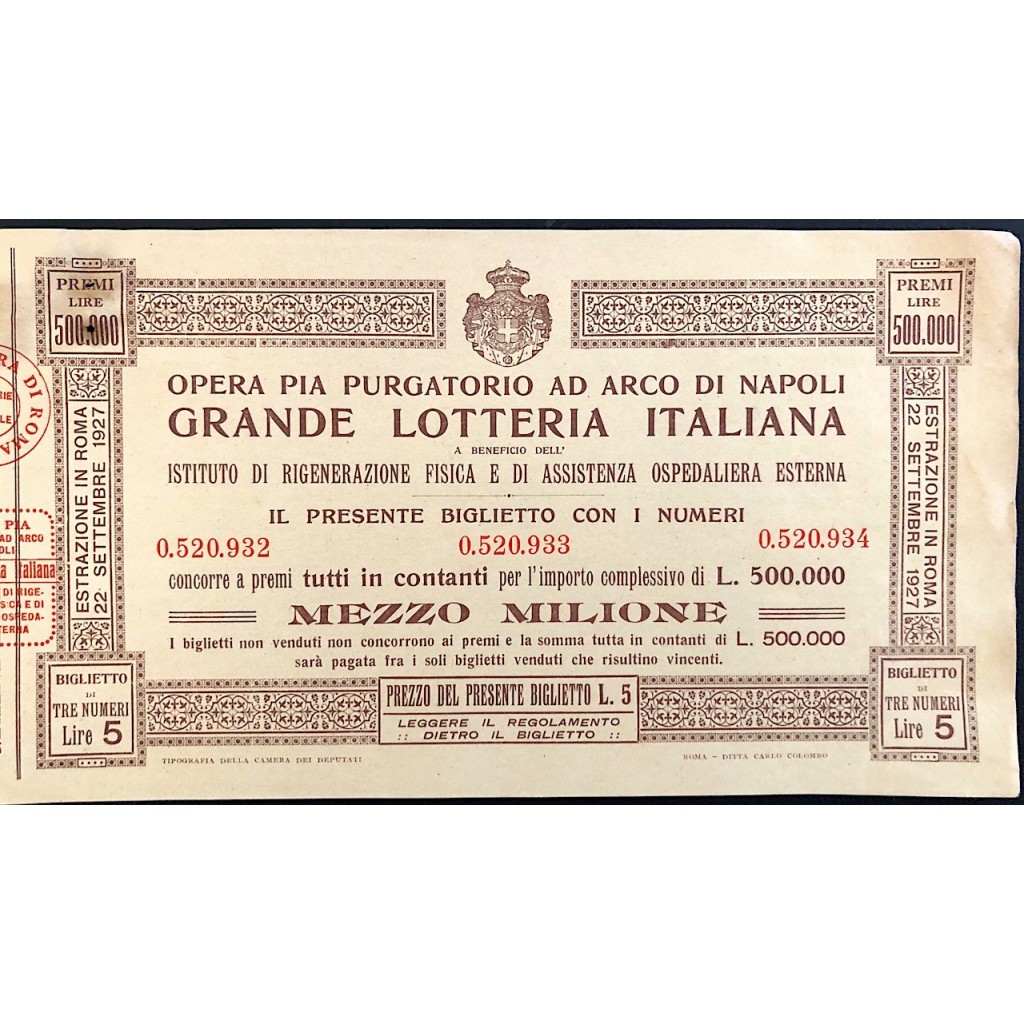 1927 - OPERA PIA PURGATORIO AD ARCO DI NAPOLI GRANDE LOTTERIA ITALIANA LIRE 5 SERIE N: 0.520.934